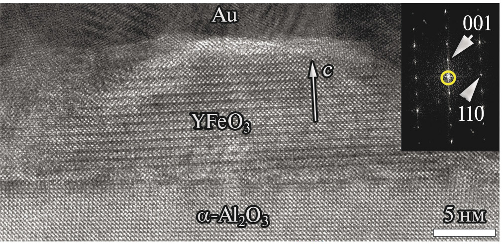 Анализ ВР ПЭМ-изображений образца с предполагаемой толщиной пленки 5 нм продемонстрировал присутствие островков о-YFeO₃, ориентированных осью c перпендикулярно поверхности подложки (рис. 9). Ориентационные соотношения совпадают с c-ориентированными островками o-YFeO₃, определенными выше для образцов с пленкой толщиной 3 нм.
