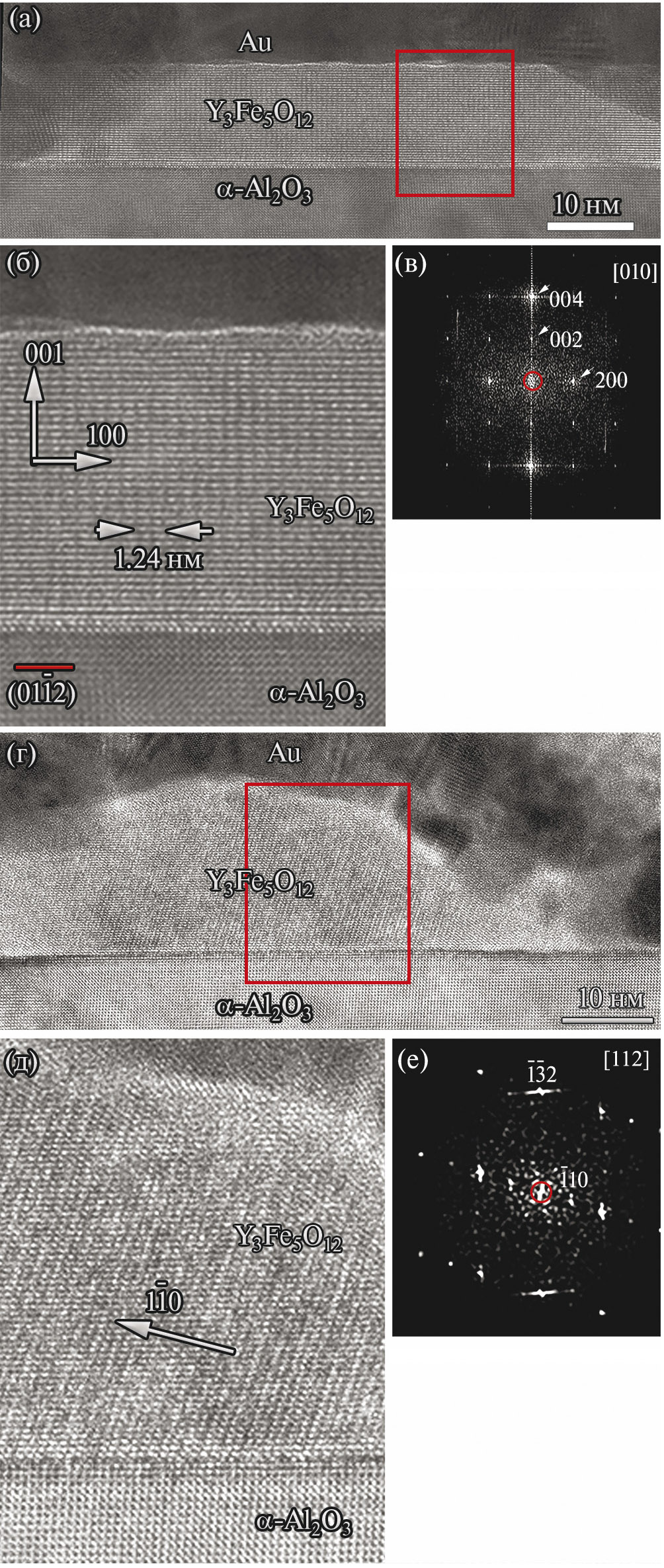 На рис. 11г и рис. 11д представлены изображения островка Y₃Fe₅O₁₂, сформировавшегося с другими ориентационными соотношениями: