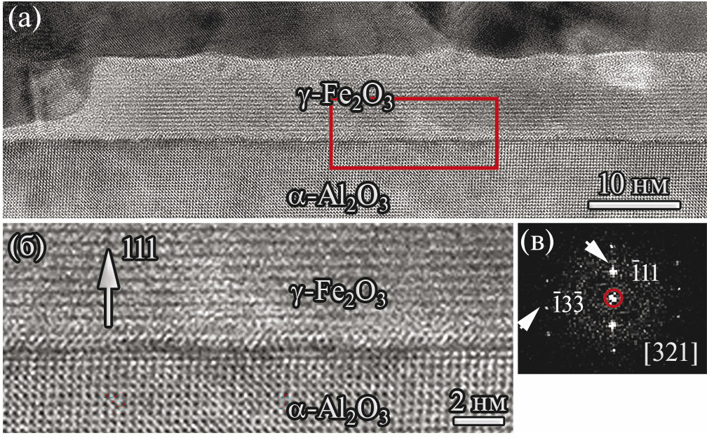 Согласно литературным данным параметры элементарной ячейки маггемита a = 0.833 нм несколько меньше параметра элементарной ячейки магнетита a = 0.838–0.840 нм [20, 21]. Дополнительная особенность изображения, представленного на рис. 7д, это наличие ступенек на границе раздела, которые показаны стрелками. Неровность в области островка оксида железа может возникнуть из-за реакции подложки с оксидом железа и образованием соединения Fe₂-xAlxO₃. Известное соединение Fe₂AlO₃ [22] характеризуется параметром элементарной ячейки a = 0.8273 нм, который близок к определенному в нашем эксперименте. В работе [23] было обнаружено, что легирование маггемита ионами Al или Сr существенно, не менее чем на 300 °C повышает температуру фазового перехода маггемита в гематит α-Fe₂O₃. Данные результаты подтверждают возможность формирования частиц маггемита.