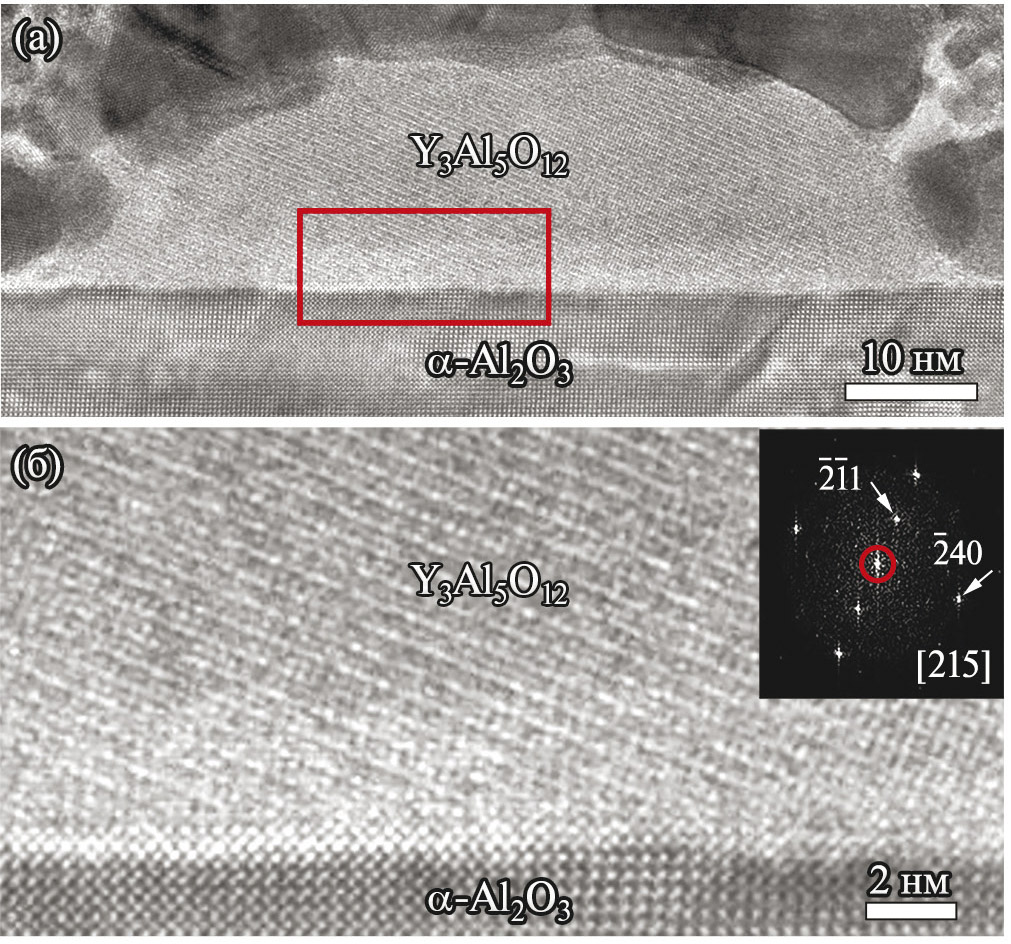 Рис. 13. (а) Типичное ВР ПЭМ-изображение островка Y₃Fe₅O₁₂ в пленке толщиной 7 нм, прямоугольником выделена область, увеличенное изображение которой приведено на (б). На вставке соответствующий двумерный спектр Фурье.