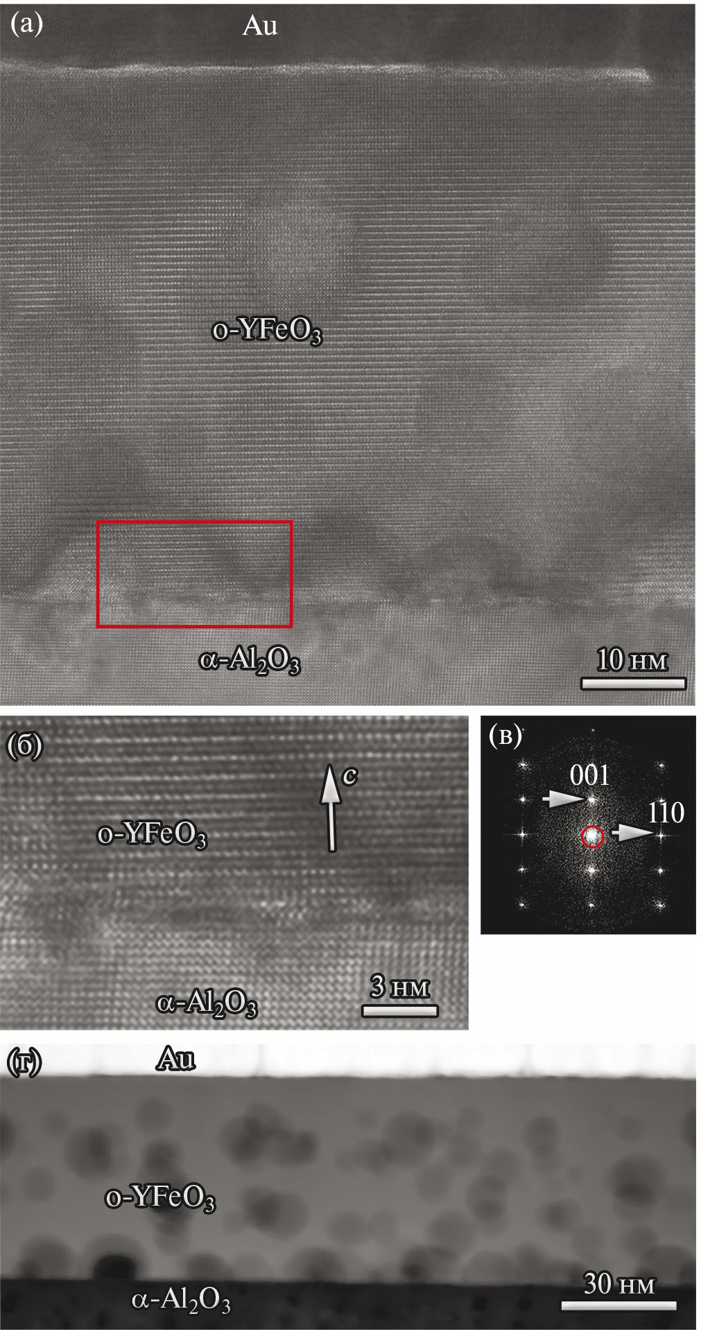Пленка фактически представляет собой доменный монокристалл. Анализ двумерного спектра Фурье показывает, что кристаллическая структура соответствует ортоферриту о-YFeO₃. Пленка ориентирована осью с перпендикулярно поверхности подложки. Межплоскостные расстояния, измеренные по изображениям ВР ПЭМ (рис. 15б) и двумерным спектрам Фурье (рис. 15в), составляют d(001) ≈ 7.5 Å, а d(110) ≈ 3.85 Å.