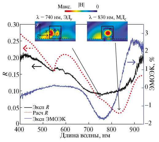 Рис. 2. Спектры отражения (черная непрерывная кривая – эксперимент, красная пунктирная – расчет), экспериментальный спектр ЭМОЭК (синяя кривая) при угле падения θ = 35°, распределение |H| при длинах волн 740 нм и 830 нм. Пунктирными кривыми со стрелками на распределениях магнитного поля указаны направления вектора напряженности электрического поля.