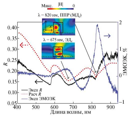 Спектры коэффициента отражения и ЭМОЭК при угле падения θ = 10° представлены на рис. 3. В спектрах отражения наблюдается минимум на длине волны 675 нм. Установлено, что возбуждается электрическая дипольная мода ЭДx, дипольный момент которой направлен вдоль оси x (см. распределение | H | на рис. 3). Данному резонансу в спектре ЭМОЭК соответствует максимум со значением 0.3 %.