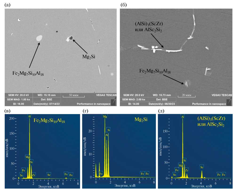 В сплавах, дополнительно легированных Sc и Zr, также обнаружены крупные интерметаллиды, содержащие железо и кремний (рис. 2б). Они представлены двумя типами морфологии. Первая, шарообразная, характерна для частиц с размером до 30 мкм, находящихся в центре зерна. Второй тип морфологии представлен расположенными на межзеренных границах частицами вытянутой формы длиной до 50 мкм с толщиной 5 мкм. Согласно химическому составу, их с определённой долей вероятности можно отнести к Fe2Mg7Si10Al18. Кроме того, были обнаружены частицы, содержащие в себе Sc, Zr и Si: они могут быть как первичными (AlSi)3(ScZr) [26], так и принадлежать к уже упоминавшейся τ(AlSc2Si2) фазе (рис. 2д). Данные частицы характеризуются вытянутой формой, с длиной 100 мкм и толщиной, варьирующейся от 1 до 5 мкм. Данные интерметаллиды не способны к модификации зеренной структуры, так как образуют ободок около межзеренных границ. В тоже время интерметаллиды способствующие измельчению зерна при литье должны быть расположены в центре кристаллитов [22].