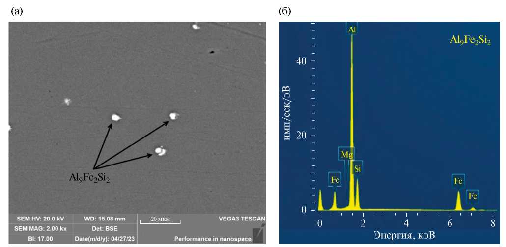 Рис. 4. Результаты СЭМ-исследований сплава AlMgSi после отжига 550 °C, 8 ч: а – изображение микроструктуры, полученное в обратно рассеянных электронах; б – EDS-анализ обнаруженных частиц (энергодисперсионная рентгеновская спектрограмма).