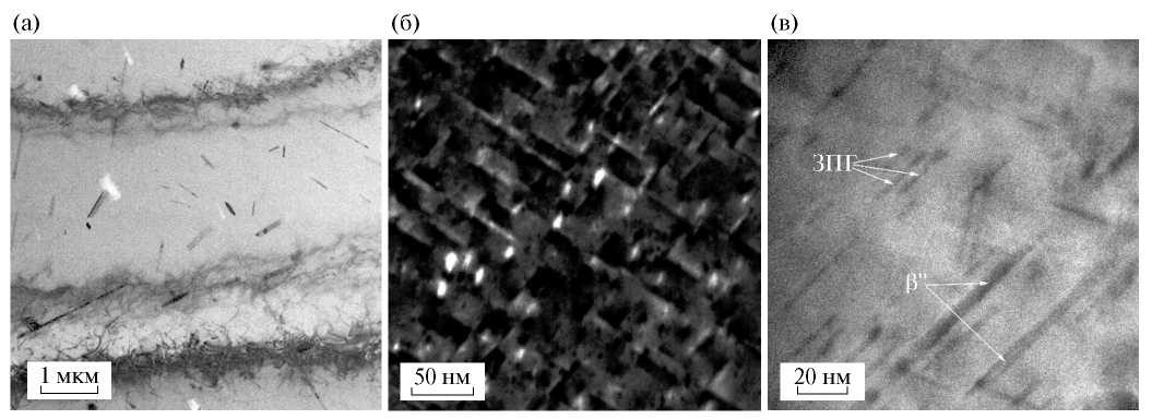 В сплаве AlMgSi при высокотемпературном отжиге происходит выделение фаз на основе Si в виде многоугольников неправильной формы размерами до 300 нм (рис. 9а). При искусственном старении 180 °C, 5ч образуются высокодисперсные игловидные выделения ЗГП и βꞌꞌ-фазы (рис. 9б, в). В целом, после старения структура сплава AlMgSi схожа со структурой сплава AlMgSiScZr после четырехступенчатой термообработки.