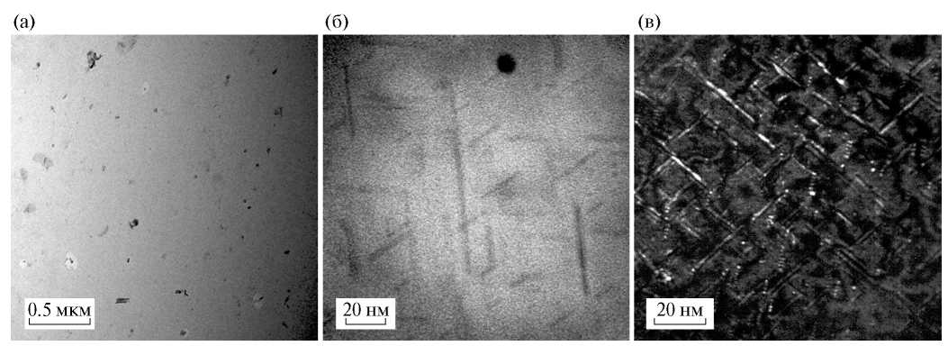 Рис. 9. Электронно-микроскопические изображения микроструктуры сплава AlMgSi после отжига: 550 °C, 8 ч + 180 °C, 5 ч: а, б – светлопольные изображения; в – темнопольное изображение в рефлексах фаз.