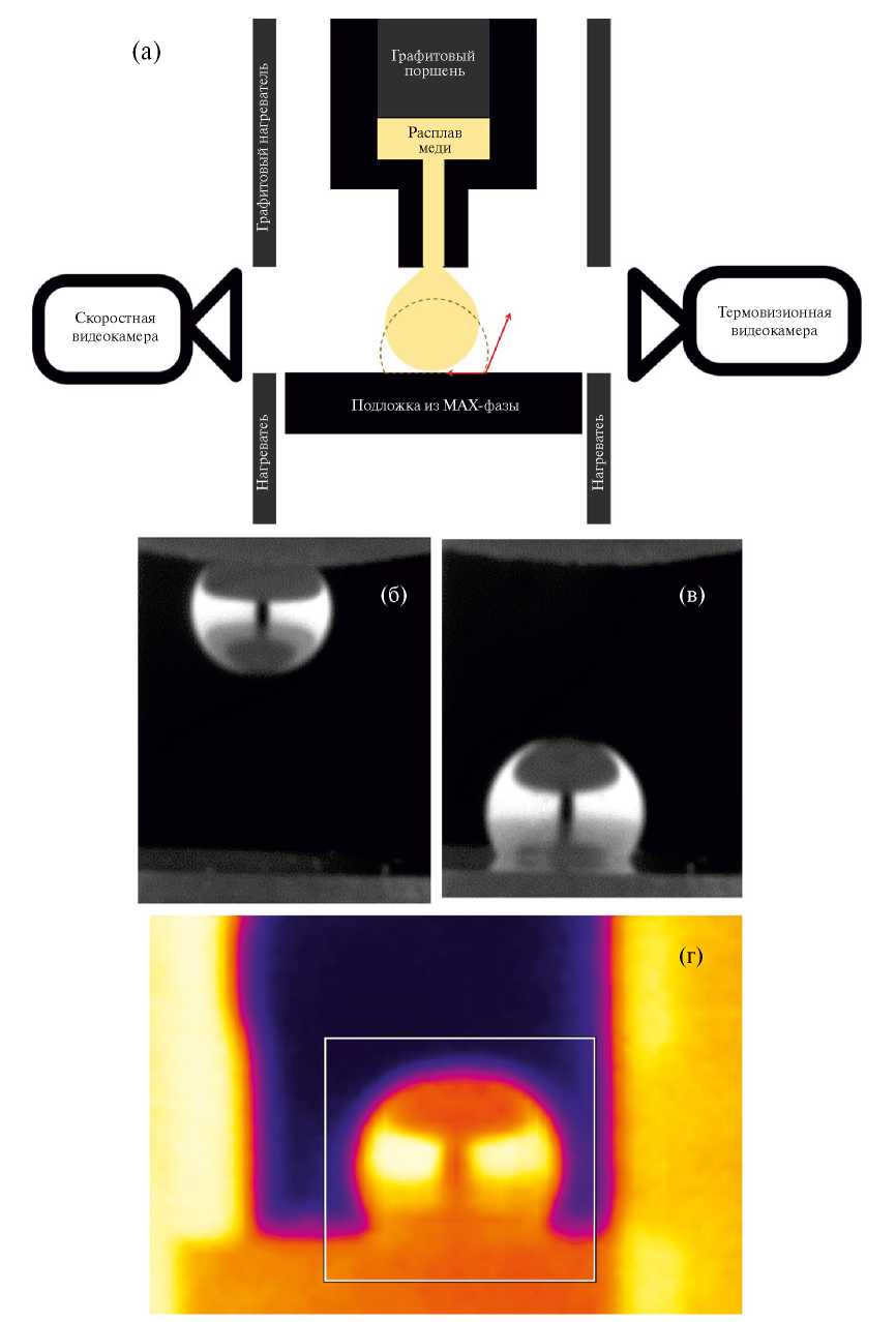 Рис. 1. Схема эксперимента (a) и вид капли меди в видеокамере при высокой температуре в подвешенном состоянии (б) и лежащей на МАХ-фазе (Cr0.75Mn0.25)2AlC (в). На (г) изображен вид капли в термовизионной камере. Стрелки на (а) показывают измеряемый контактный угол.