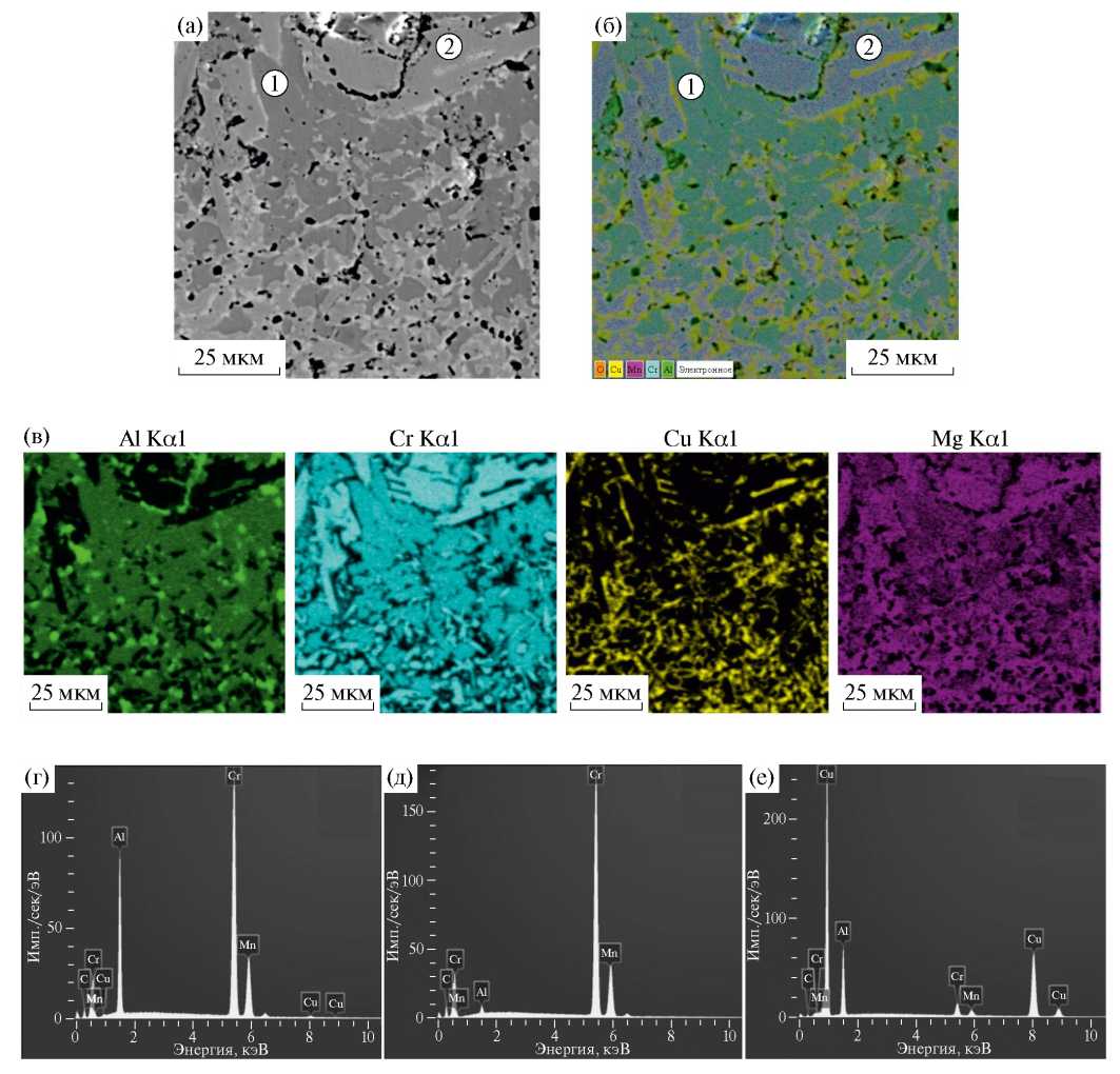 Рис. 5. СЭМ-изображение (а) и карты распределения хрома, алюминия, меди и марганца у фронта формирования и распространения расплава (б–в) внутри пористого (Cr0.75Mn0.25)2AlC после пропитки. Приведены МРСА-спектры для МАХ-фаз (г, спектр 1) и карбида хрома, содержащего марганец (д, спектр 2). Спектр на (е) получен с области расплава (прослойки между фазовыми составляющими 1 и 2).