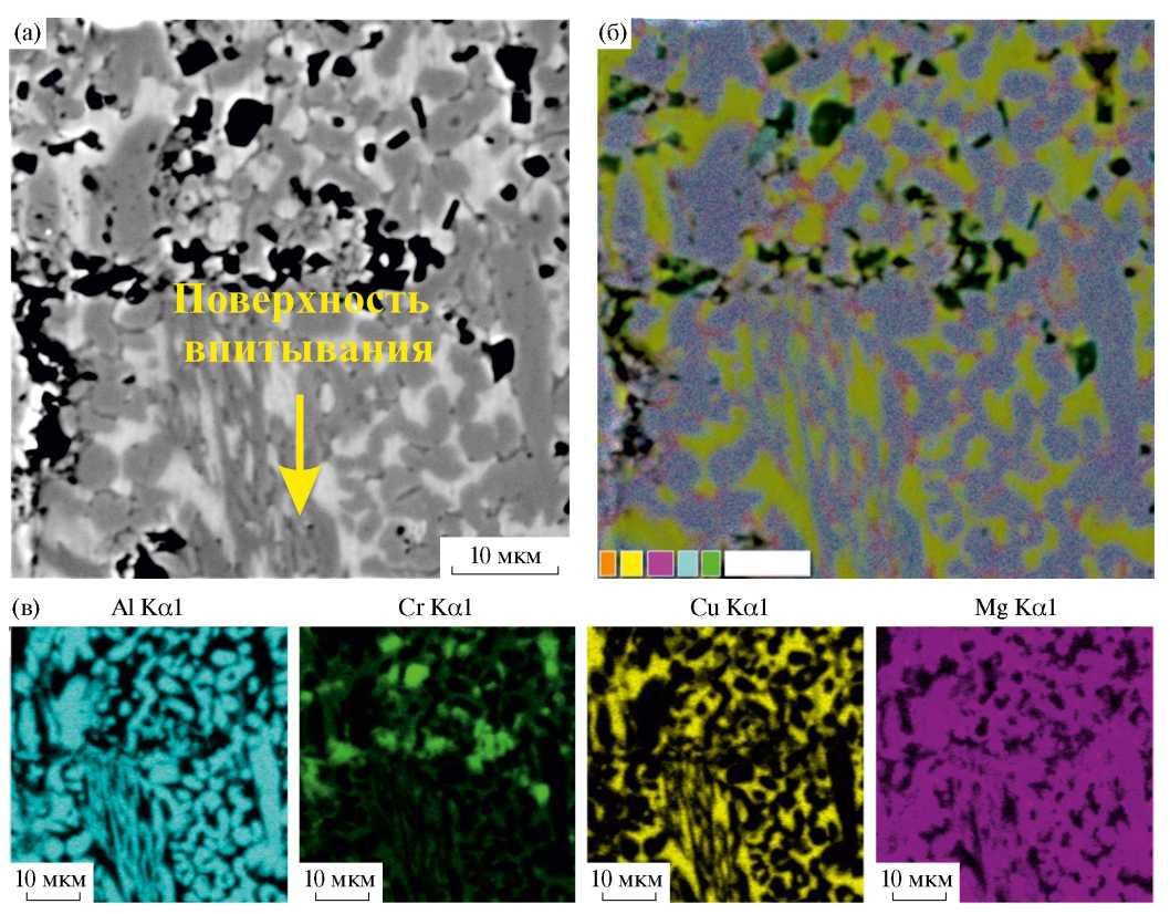 Такое значительное изменение контактного угла и низкое поверхностное натяжение расплава меди трудно объяснимо в рамках моделей жидких расплавов алюминия, хрома или марганца в меди – все они хотя и являются поверхностно активными, но снизить более чем в два раза поверхностное натяжение не могут [25, 26]. Более правдоподобное объяснение может быть связано с влиянием кислорода и образованием сложных оксидов на поверхности расплава. Вакуум 10–3 Па не является достаточным для предотвращения окисления алюминия и хрома. Это косвенно подтверждается матовостью (отсутствием металлического блеска) поверхности капли в конце впитывания (рис. 7в) и выделениями оксида алюминия в области впитывания.
