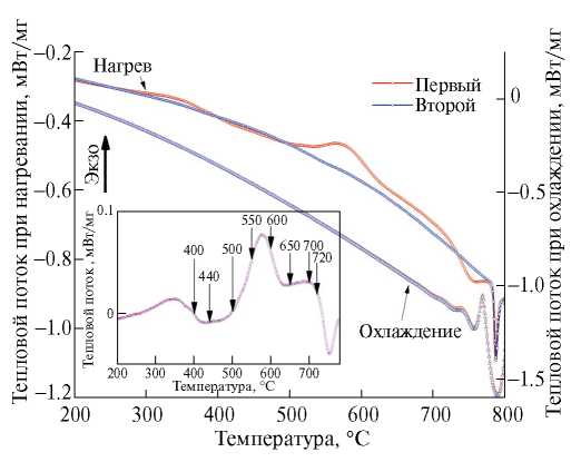 Для анализа температур фазовых превращений в быстрозакаленных лентах была проведена дифференциальная сканирующая калориметрия. Нагрев образцов осуществляли дважды. ДСК-кривые нагрева и охлаждения приведены на рис. 3. На кривой повторного нагрева в интервале температур от 20 до 750 °C отсутствовали какие-либо эффекты, поэтому она была использована в качестве базовой линии для выделения тепловых эффектов на кривой первичного нагрева. Разность тепловых потоков кривых первого и повторного нагрева показана на вставке рис. 3. Анализ выявил наличие нескольких тепловых эффектов в следующих интервалах температур: