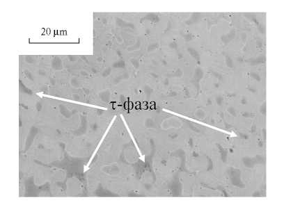 Анализ параметров решётки τ-фазы показал следующее. После отжига при температуре 440 °C параметры решётки τ-фазы составили а = 2.786 Å, с = 3.524 Å, отношение параметров с/а = 1.265. Проведение исследования данной ленты методом РЭМ в сигнале отражённых электронов показало наличие малых тёмных областей внутри исходной ε-фазы (рис. 6). Тёмный оттенок указывает на то, что эти области обеднены по элементам с большим атомным номером (в данном случае, по Mn или Ga). Обеднение τ-фазы по этим элементам приводит к уменьшению степени тетрагональности решётки, что согласуется с результатами рентгеноструктурного анализа. Авторы работы [11] отмечают отличия состава фаз L10 (ε) и L10 (γ2) по содержанию Mn. Однако в настоящем исследовании достоверно установить состав τ-фазы после отжига при 440 °C методом микрорентгеноспектрального анализа не представлялось возможным ввиду малого размера областей.
