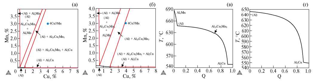Рис. 2. Расчетные изотермические сечения системы Al–Cu–Mn при 350 °C (а) и 425 °C (б) и кривые неравновесной кристаллизации по модели Sheil-Gulliver (зависимость суммарной доли твердых фаз Q от температуры) (в – все фазы включены в расчет, г – Mn-содержащие фазы исключены).