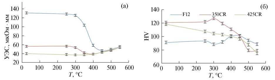 После отжига при 400 °C обе ленты имеют одинаковые значения УЭС (38.7 мкОм·мм), но разную твердость (111 и 100 HV в состояниях 350S-400 и 425S-400 соответственно), поэтому режим получения ленты 350S представляется предпочтительным, поскольку он предполагает лучшее сочетание электропроводности, прочности и термостойкости.