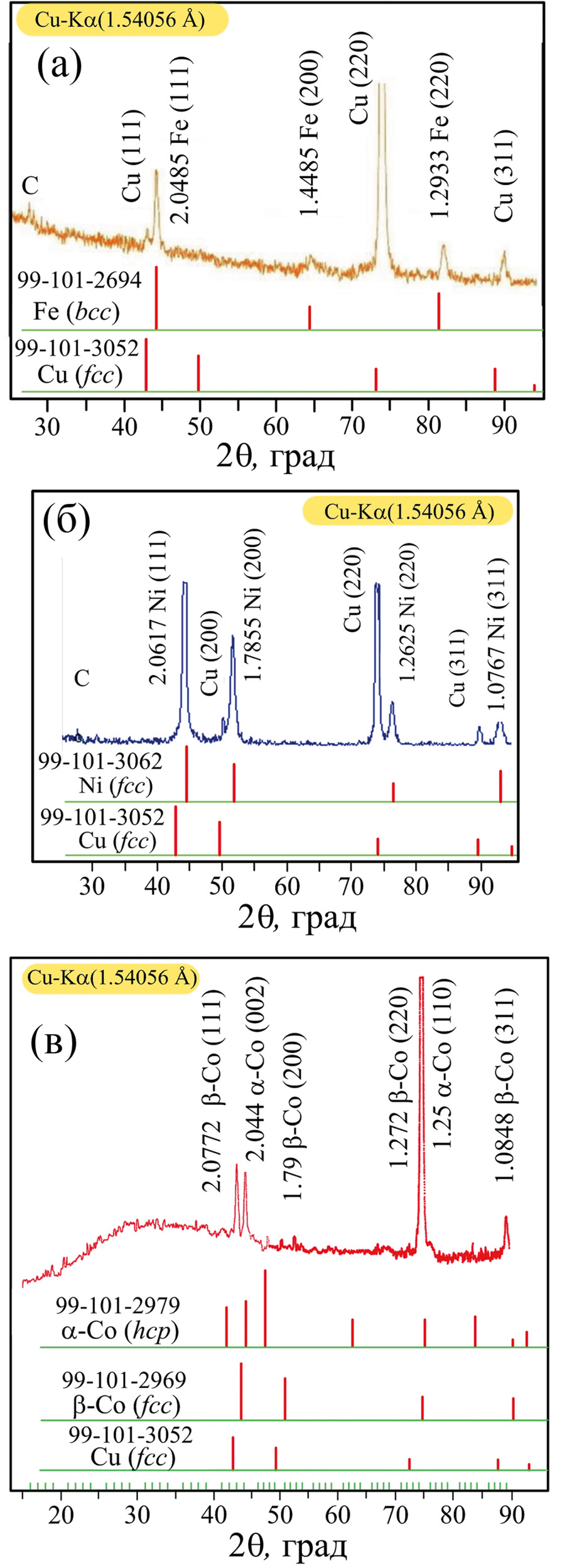 Рис. 1. Данные рентгеновской дифракции покрытий Fe/С (а), Ni/С (б), Co/С (в) и карточки элементов из базы данных ICDD под каждой дифрактограммой. У каждого пика перед символом химического элемента представлена величина межплоскостного расстояния в Å, в скобках указаны индексы Миллера