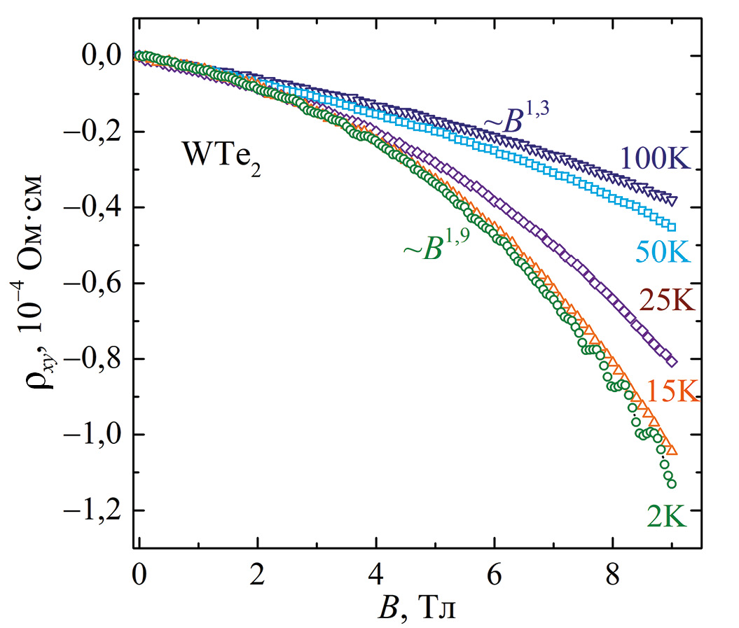 Рис. 4. Полевые зависимости холловского сопротивления ρxy(B) монокристалла WTe2 при температурах от 2 до 100 К в полях до 9 Тл