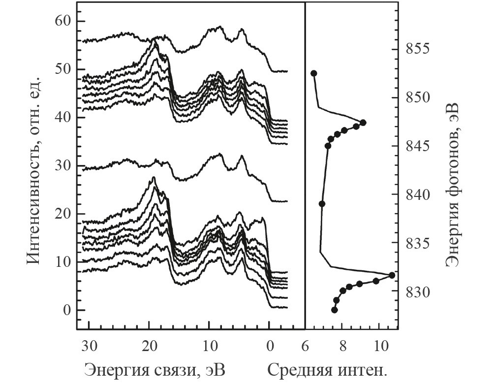 Рис. 4. Mn L2,3-резонанс. Нормированные на среднюю интенсивность спектры валентной полосы. Соответствующие энергии возбуждения показаны точками на зависимости средней интенсивности фотоэмиссии от энергии фотонов (спектр поглощения).