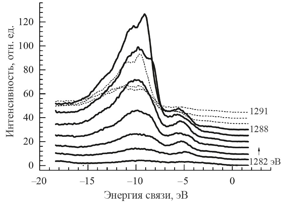 На рис. 5 изображены рентгеновские фотоэмиссионные спектры валентной полосы, полученные при энергии возбуждения от 1282 до 1291 эВ с шагом 1 эВ. Спектры равномерно смещены по вертикали. Максимальная интенсивность наблюдается при энергии фотонов 1288 эВ, далее идет равномерный спад, соответствующие спектры изображены штриховыми линиями. Поглощение фотона сопровождается переходом 3d5/2-электрона Dy в валентные 4f-состояния. Возникает долгоживущее возбужденное состояние, которое распадается путем обратного перехода на 3d5/2-уровень с выбросом второго электрона в свободные состояния за счет очень сильного кулоновского взаимодействия хорошо локализованных на атоме электронов. Кулоновское взаимодействие электронов во много раз сильнее взаимодействия электрона с электромагнитной волной, тем более большой частоты. В результате интегральная фотоэмиссия при возбуждении с энергией 1288 эВ возрастает в 13 раз по сравнению с нерезонансным значением при հν=1282 эВ. Рост максимума с энергией связи 10 эВ во много раз больше. Хорошо видно, что f-состояния диспрозия формируют валентную полосу в этой области.