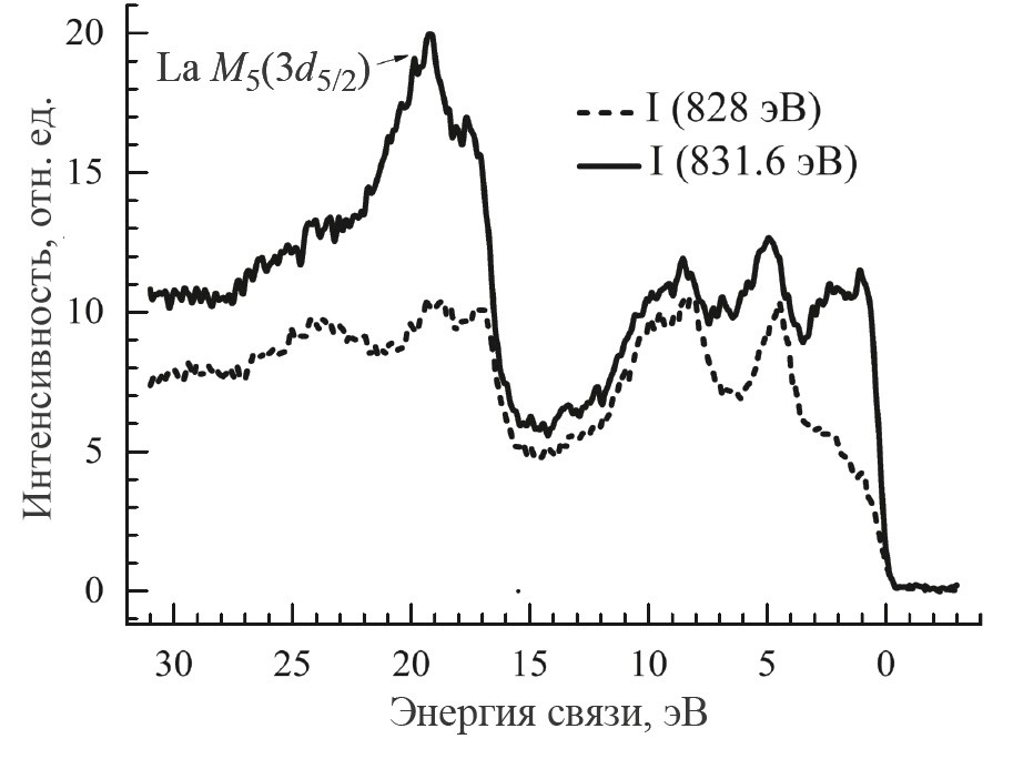 Фотоэмиссионные спектры валентной полосы при резонансном возбуждении La показаны на рис. 7. Интенсивность фотоэмиссии в резонансном режиме существенно больше, вблизи уровня Ферми, указывая на то, что здесь сосредоточены состояния лантана. Кроме того, значительно увеличивается выход фотоэмиссии из локализованных La 5p-состояний 19.3 и 16.8 эВ, которые оказывается сильно взаимодействуют с валентными электронами. Энергия связи уровня La 3d5/2 равна 836 эВ, наблюдается сдвиг резонанса на 4.4 эВ за счет притяжения электрона и дырки в промежуточном состоянии.