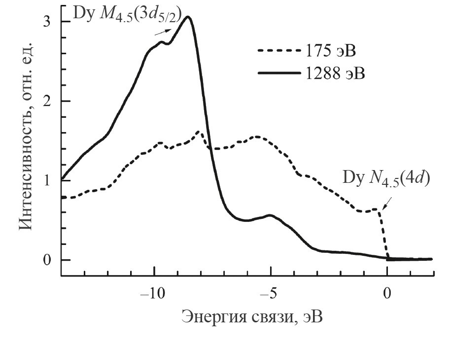 где (*) обозначает возбужденное состояние, n соответствует числу электронов, заполняющих уровень 4f (n = 10 для состояний Dy3+). Полученное конечное состояние точно такое же, которое возникает результате прямой фотоэмиссии 4f-электрона из валентной полосы. Фотопоглощение на локализованных внутренних уровнях многократно превышает фотопоглощение на делокализованных валентных состояниях, поэтому резонансная эмиссия значительно превышает вероятность прямого выхода электронов из валентных полос (сравните кривые 1282 эВ и 1288 эВ нa рис. 5). Резонансная фотоэмиссия проявляет высокую чувствительностью к заполнению 4f-оболочки и степени окисления редкоземельного элемента. Резонансный пик в трехвалентном диспрозии при 1288 эВ очень чувствителен к химическому окружению иона Dy и может определять концентрацию ионов Dy2+ и Dy3+ [21].