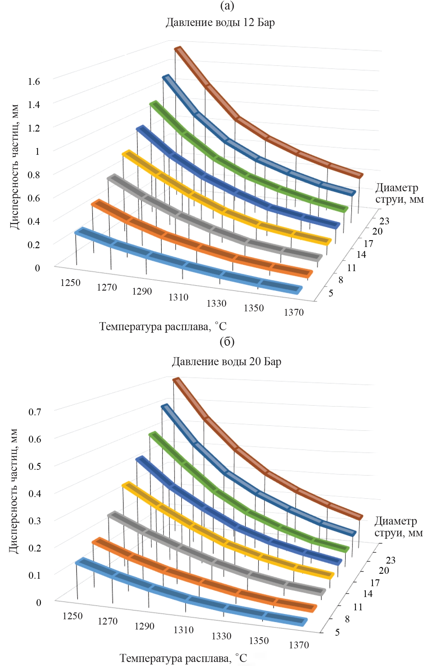 В ходе экспериментов установили, что в процессе ГВД для осуществления режима тонкого измельчения (0–100 мкм) необходимо повысить мощность диспергирования расплава путем увеличения давления инжектируемой в камере диспергации воды от 12 до 16–20 бар. Это приводит к уменьшению номинального весового соотношения расхода расплава с расходом воды от уровня 1:45÷1:50 до 1:60÷1:70. Данных параметров можно достичь как увеличением производительности гидронасоса, так и уменьшением диаметра керамической насадки 6 (рис. 1), предназначенной для вакуумного вертикального забора расплава. Также было установлено, что на интенсивность и характер диспергирования существенное влияние оказывает начальная температура диспергируемого расплава. Влияние температуры и диаметра всасываемой в диспергатор струи СЧ20 на дисперсность получаемых частиц при разных давлениях нагнетания воды изображено в виде представленных на рис. 9 трехмерных диаграмм. Видно, что чем выше температура и меньше диаметр всасывающей насадки, тем мелкодисперснее получаемый порошок.