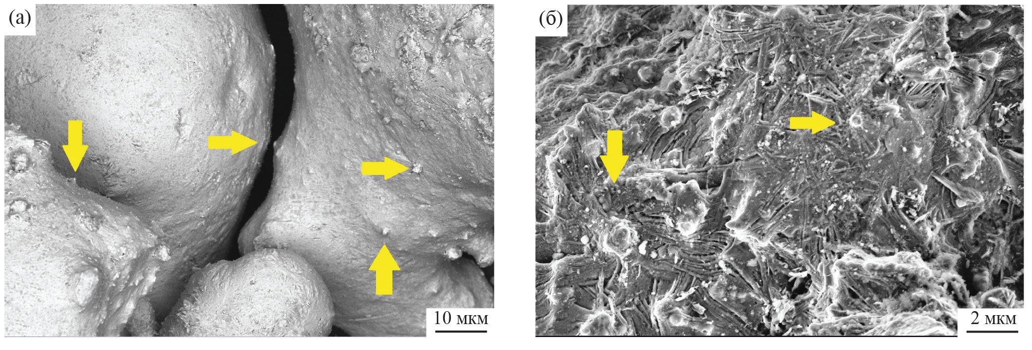 Рис. 3. Поверхность частицы с кавитационным абляционным кратером (а) и с образованными впоследствии сателлитными сфероидальными частицами размером 0.1–1.3 мкм (б).