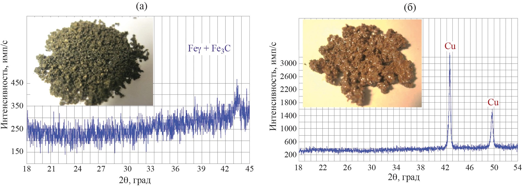 Рис. 11. Рентгеновская дифрактограмма ГВД-порошка чугуна (а) и извлеченной с его помощью меди (б).