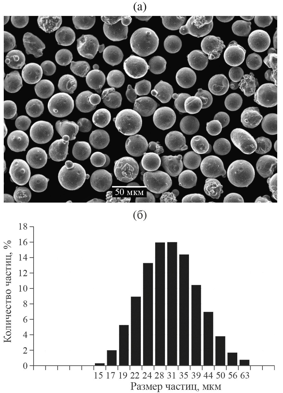Гранулометрический состав порошка исследован на лазерном анализаторе размера частиц SALD-2300 Shimadzu. Изображения частиц порошка приведены на рис. 1а, а гистограмма распределения частиц по размерам – на рис. 1б. Показано, что средний размер частиц составляет ≈ 30 мкм, величина d75 не превышает 40 мкм.