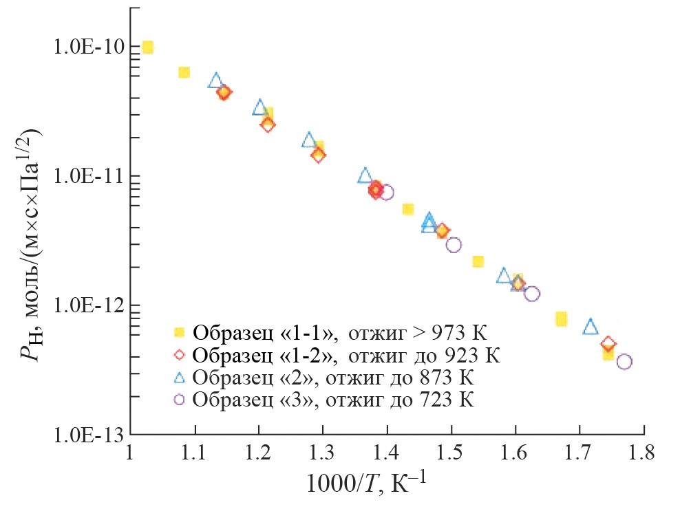 Исследование различных параметров водородопроницаемости (ВП) мембранных образцов (коэффициентов диффузии, проницаемости и растворимости водорода) проведено на специализированном стенде в диапазоне температур 300–700°С [29].