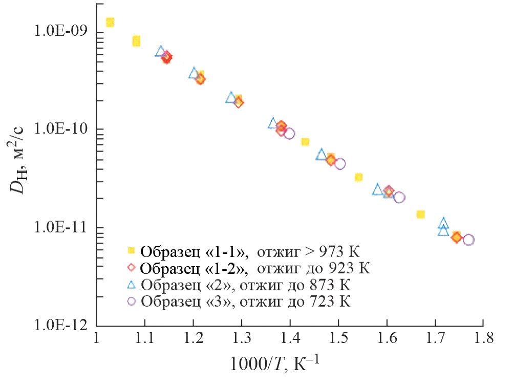 Так, в работе [24] изучалась водородопроницаемость в диапазоне температур от 623 до 773 К при давлении 1.013·105 Па мембранных образцов диаметром 20 мм и толщиной 0.2 мм из стали 316L, изготовленных по технологии ПЛС (далее по тексту – сталь 316L-ПЛС). Было показано, что коэффициент диффузии водорода в этой стали примерно в 4 раза выше коэффициента диффузии водорода в стали 316L, изготовленной по “традиционной” технологии. Разница в коэффициентах диффузии объясняется наличием в cтали 316L-ПЛС разветвлённой сети субзеренных границ.