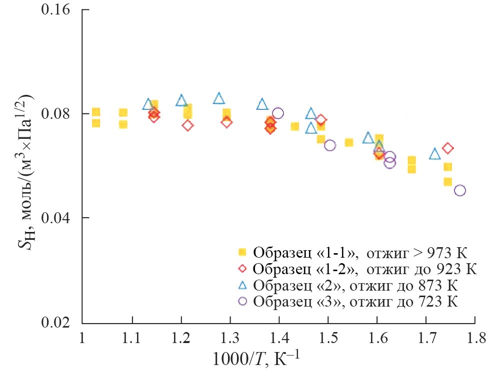 Растворимость водорода в стали 316L-ПЛС определялась путем измерения количества водорода, десорбированного из наводороженных призматических образцов [33]. Образцы наводороживали на установке высокого давления [31] при давлении 40 МПа и температурах 400, 500 и 600°С в течение 48, 16 и 4 ч соответственно. Параметры наводороживания выбраны из условия достижения равновесной концентрации водорода в образцах. После наводороживания контейнер с образцами охлаждался в воде, содержание водорода в стали 316L измерено с помощью газоанализатора ОН 900 фирмы “ELTRA” методом плавления образцов в потоке инертного газа-носителя. Время между окончанием наводороживания образцов и измерением в них концентрации водорода не превышает 15 мин. Для сравнения в аналогичных условиях определена также растворимость водорода в цилиндрических образцах диаметром 4 мм и длиной до 8 мм из стали 12Х18Н10Т.