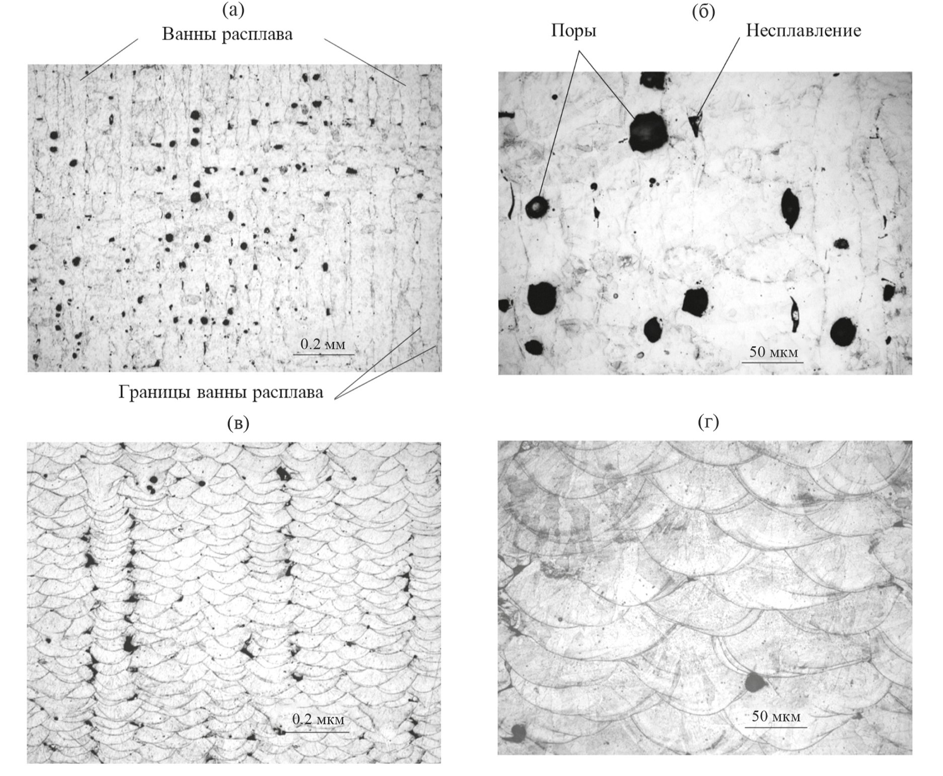 Макроструктура стали 316L-ПЛС формируется из частично перекрывающихся следов от застывших ванн расплавов, вид и геометрические размеры которых определяются режимом и стратегией построения образцов: в плоскости, перпендикулярной направлению построения, она представляет собой сетку ванн расплавов, пересекающихся под углом 90° (рис. 5а, б), а в плоскости, параллельной направлению построения, имеет вид так называемой “рыбьей чешуи” [37, 41] (рис. 5в, г). В макроструктуре образцов встречаются дефекты в виде пор и несплавлений, как правило, расположенных по границам ванн расплава (рис. 5а, б). Принято считать [37–40], что образование дефектов обусловлено неоптимальными параметрами режима изготовления образцов.