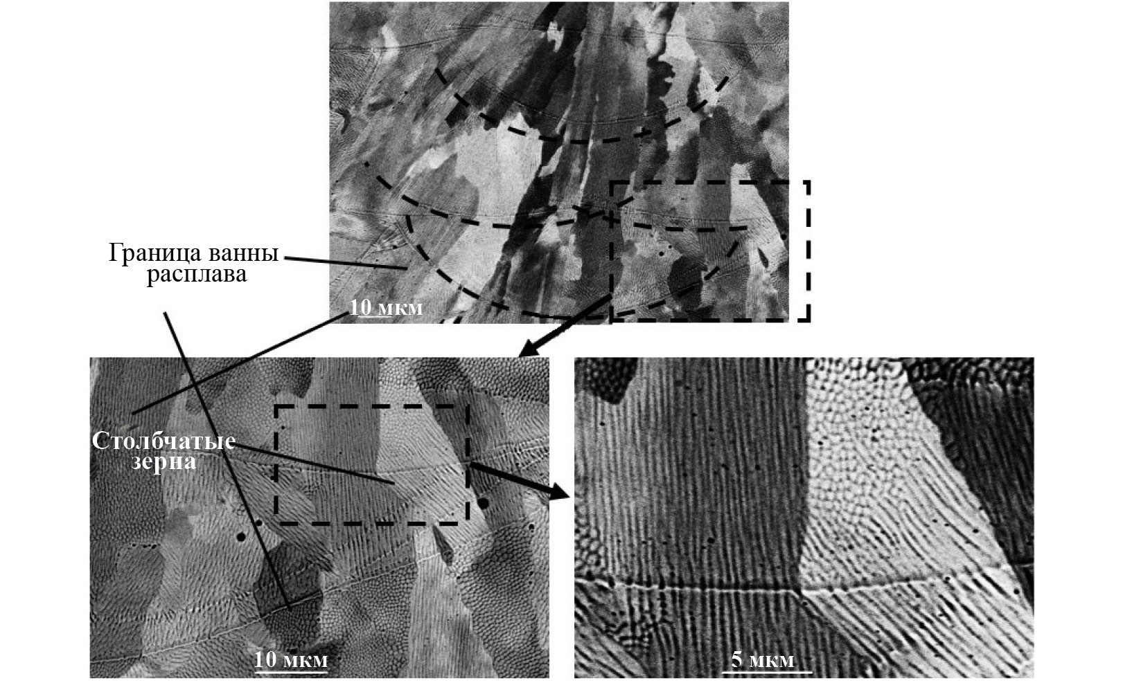 Повышение температуры испытаний до 550–600°С (образец “2”) привело к заметному изменению структуры – границы ванн расплава стали менее выраженными, уменьшилось количество столбчатых зерен с ячеистой структурой, появились рекристаллизованные зерна (рис. 9г).