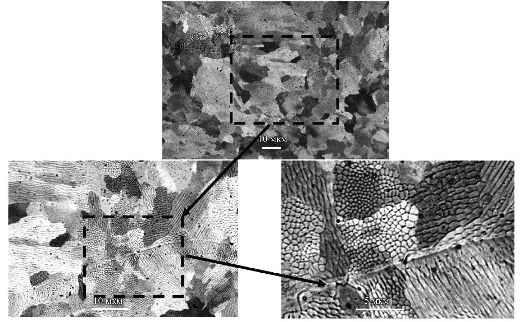 Структура стали 316L-ПЛС в исходном состоянии и после воздействия приведена на рис. 5–10. В результате быстрых нагревов и охлаждений при послойном построении образцов сталь 316L-ПЛС имеет иерархическую структуру, которую следует анализировать на макро-, мезо- и микроуровнях [28, 32, 36–40].