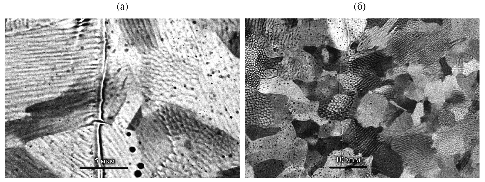 Рис. 8. Структура стали 316L-ПЛС после наводороживания при температурах 500° (а) и 600°С (б) в плоскости, перпендикулярной направлению построения (растровая электронная микроскопия).
