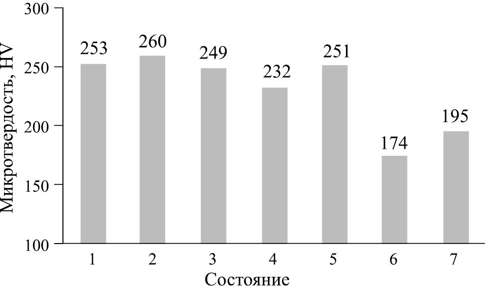 Рис. 11. Результаты измерения микротвердости стали 316L-ПЛС: 1 – исходное состояние; 2 – после наводороживания; 3 – после испытаний на водородопроницаемость; 4 – после отжига 1075°С, 1 ч; 5 – после отжига 1075°С, 1 ч и наводороживания при 40 МПа, 600°С, 44 ч; 6 (пруток из стали 12Х18Н10Т) – после отжига 1075°С, 1 ч; 7 (пруток из стали 12Х18Н10Т) – после отжига 1075°С, 1 час и наводороживания при 40 МПа, 600°С, 44 ч.