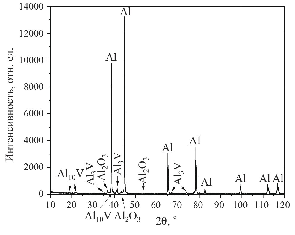 Рентгенофазовый анализ (рис. 1) показал, что в составе изделия, полученного из сплава Al–2.3%V на 3D-принтере, помимо металлического Al в количестве 93 мас. % присутствуют интерметаллиды Al3V (5 мас. %), Al10V (1 мас. %) и оксид Al2O3 (1 мас. %). Твердость СЛС-образца Al–2.3%V оказалась значительно выше (73 ± 2 HV0.1) по сравнению с твердостью образца, полученного 3D-печатью из первичного алюминия (41 ± 2 HV0.1).