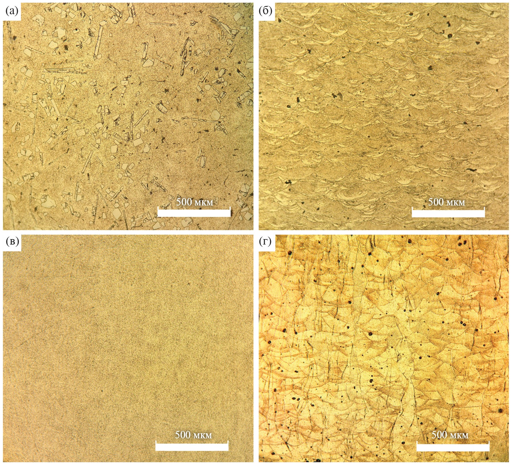 Рис. 2. Структура материала в поперечном сечении изделий из порошков Al–2.3%V (а, б) и первичного Al марки АПК (в, г). а) и в) образцы, полученные путем переплава; б) и г) СЛС-образцы.