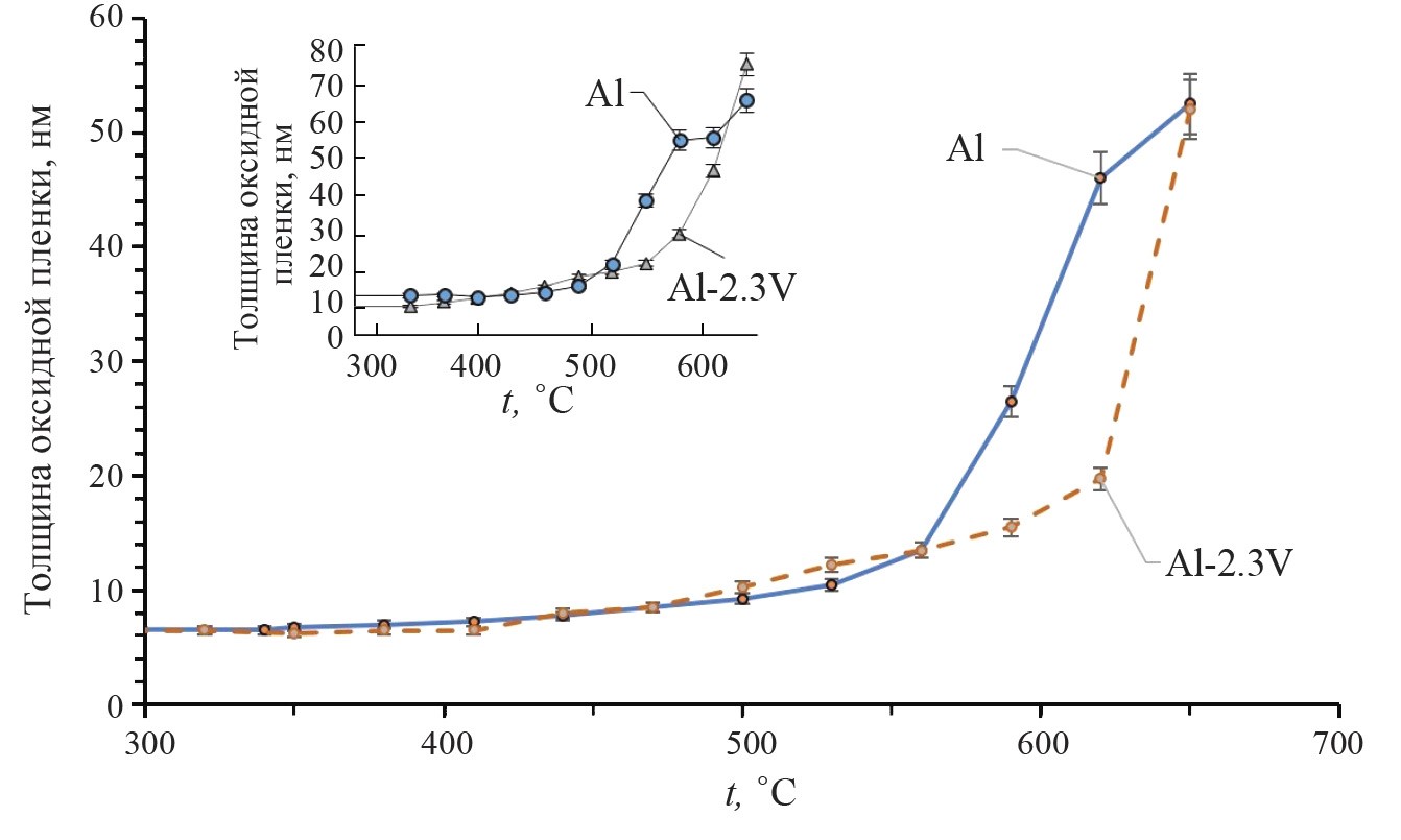 Видно, что интенсивное окисление СЛС-образца из первичного Al происходит при более низкой температуре, чем из сплава Al–2.3%V. Проведенные исследования термического окисления исходных прессованных порошков Al и Al–2.3%V (таблетки диаметром 10 мм, давление прессования 4500–5000 кПа) в аналогичных условиях нагрева дали похожие результаты (рис. 3, вставка). Таким образом, термическая устойчивость СЛС-материалов из первичного алюминия и сплава с ванадием сохраняется до температуры около 520°С. При температурах близких к плавлению, процесс окисления сплава ускоряется, что может быть связано с появлением оксида ванадия V2O5.