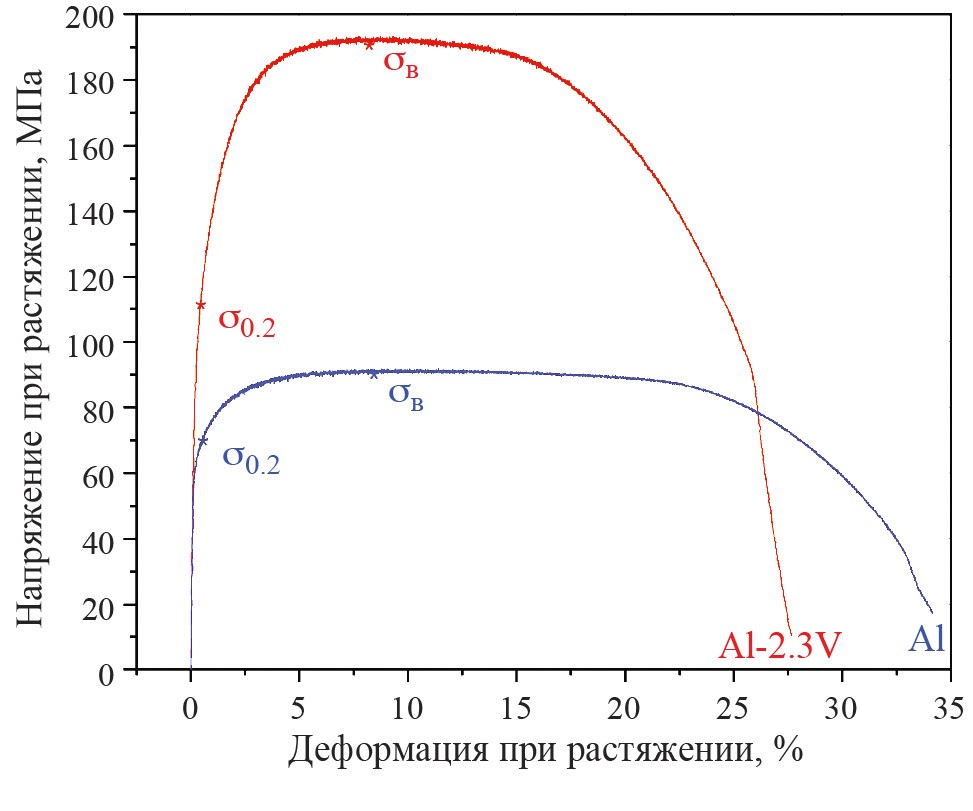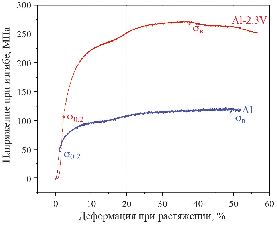 Известно, что модифицированный материал, у которого были существенно улучшены прочностные свойства, значительно теряет в пластичности [23–26]. Для исследованного СЛС-материала данный недостаток отсутствует, пластические свойства сплава Al–2.3%V практически не изменились по сравнению со свойствами первичного Al без ТО (отличие не превышает 1.2%).