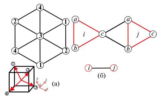 Рис. 1. Четырехкомпонентная модель Поттса на треугольной решетке (а); описание адсорбции на основе модели Поттса (б).