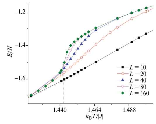 угловые скобки означают термодинамическое усреднение. Температурные зависимости энергии E на один узел приведены на рис. 2. Как видно из рисунка, температурная зависимость энергии E для четырехкомпонентной модели Поттса при L=160 демонстрирует слабо выраженный скачок энергии. Это обусловлено тем, что для модели Поттса число состояний спина q=4 является граничным, и для конечных L может наблюдаться фазовый переход II рода, близкий к фазовому переходу I рода. Для полного выяснения особенностей рода фазового перехода в решеточных моделях Поттса следует комплексно исследовать температурные зависимости всех термодинамических параметров.