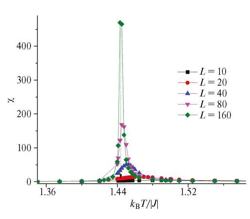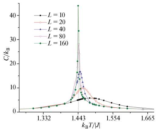 где K=J/kBT, , Ni — число спинов в состоянии с Pi, N=L2 — число магнитных узлов, угловые скобки означают термодинамическое усреднение, нормированное на N2, — спонтанная намагниченность рассматриваемой системы с линейным размером L. В частности, с увеличением линейного размера системы L максимум теплоемкости и магнитной восприимчивости достаточно хорошо приближается к критическому значению и для температурных зависимостей рассматриваемых параметров наблюдаются ярко выраженные максимумы (см. рис. 3 и рис. 4).