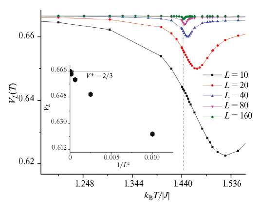 для разных размеров решетки в зависимости от температуры T приведены на рис. 7. Как видно из вставки к рис. 7, значения VL(T) при T=Tc и L→∞ стремятся к тривиальному значению V *=2/3: