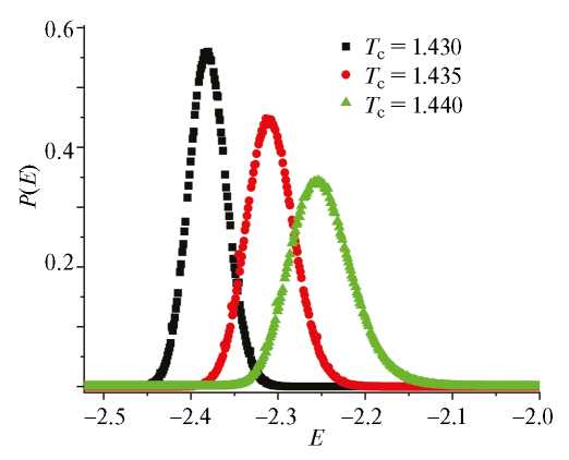 Аналогичную картину наблюдали для четырехкомпонентной модели Поттса на гексагональной решетке в работах [15, 16]. Гистограммный анализ данных, проведенный для четырехкомпонентной модели Поттса на треугольной решетке, также свидетельствует о наличии ФП II рода. Это продемонстрировано на рис. 8 для спиновой системы с L=160. В зависимости вероятности P от энергии E для всех трех различных значений температуры вблизи Tc наблюдается один хорошо выраженный максимум, что характерно для ФП II рода.