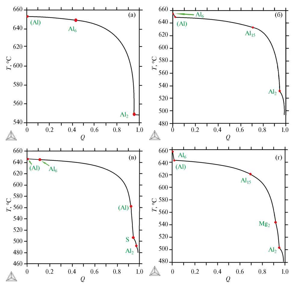 Рис. 3. Расчетные зависимости массовой доли твердых фаз (Q) от температуры при неравновесной кристаллизации для экспериментальных сплавов (см. табл. 1): (а) A-0; (б) A-1; (в) A-2; (г) A-3. Обозначение фаз см. на рис. 1, 2.