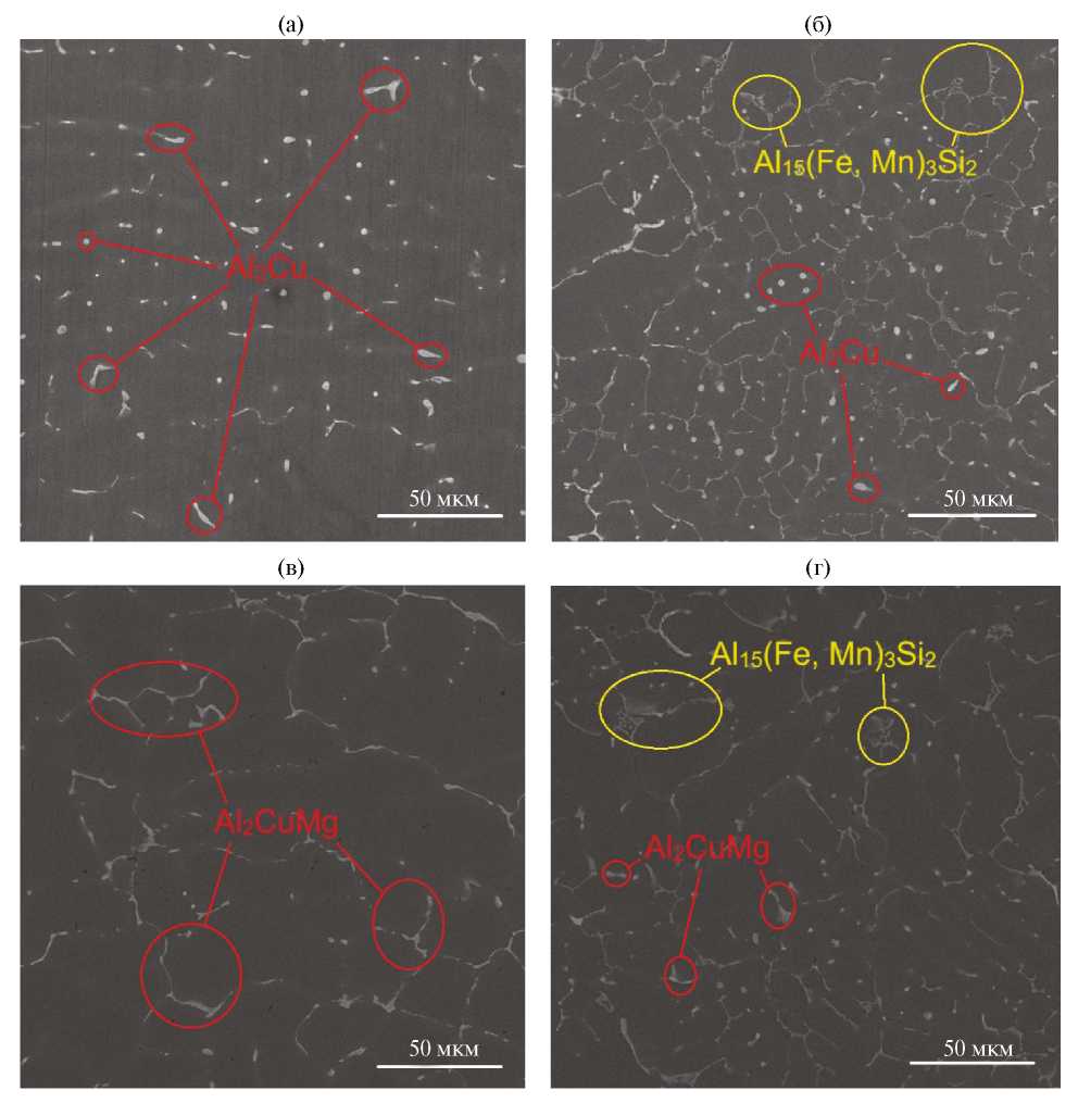 Анализ микроструктур слитков, приведенных на рис. 4, показывает, что фазовый состав всех экспериментальных сплавов достаточно хорошо коррелирует с расчетными зависимостями T–Q (рис. 3). Единственное несоответствие заключается в том, что в сплавах А-1 и А-3 происходит подавление образования фазы Al6(Fe,Mn). Как известно из ранних исследований [10–12], это является следствием повышенной скорости охлаждения слитков при кристаллизации и низкой диффузии марганца при высоких температурах, из-за чего этот элемент в сплавах А-0 и А-2 (рис. 4а, в) практически полностью остается в твердом растворе алюминия, а в сплавах с железом и кремнием А-1, А-3 (рис. 4б, г) частично расходуется на образование фазы Al15(Mn,Fe)3Si2. В качестве примера на рис. 5 приведены карты распределения элементов в микроструктуре слитка сплава А-3, подтверждающие идентификацию фаз Al15(Mn,Fe)3Si2, Al2Cu, и Mg2Si.