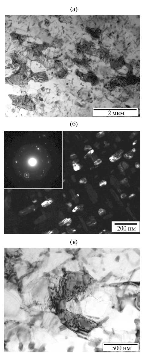Рис. 8. Дисперсоиды Al20Cu2Mn3 в структуре отожженного холоднокатаного листа сплава А-2, ПЭМ: (а), (в) светлопольные изображения; (б) темнопольное изображение в рефлексе Al20Cu2Mn3.