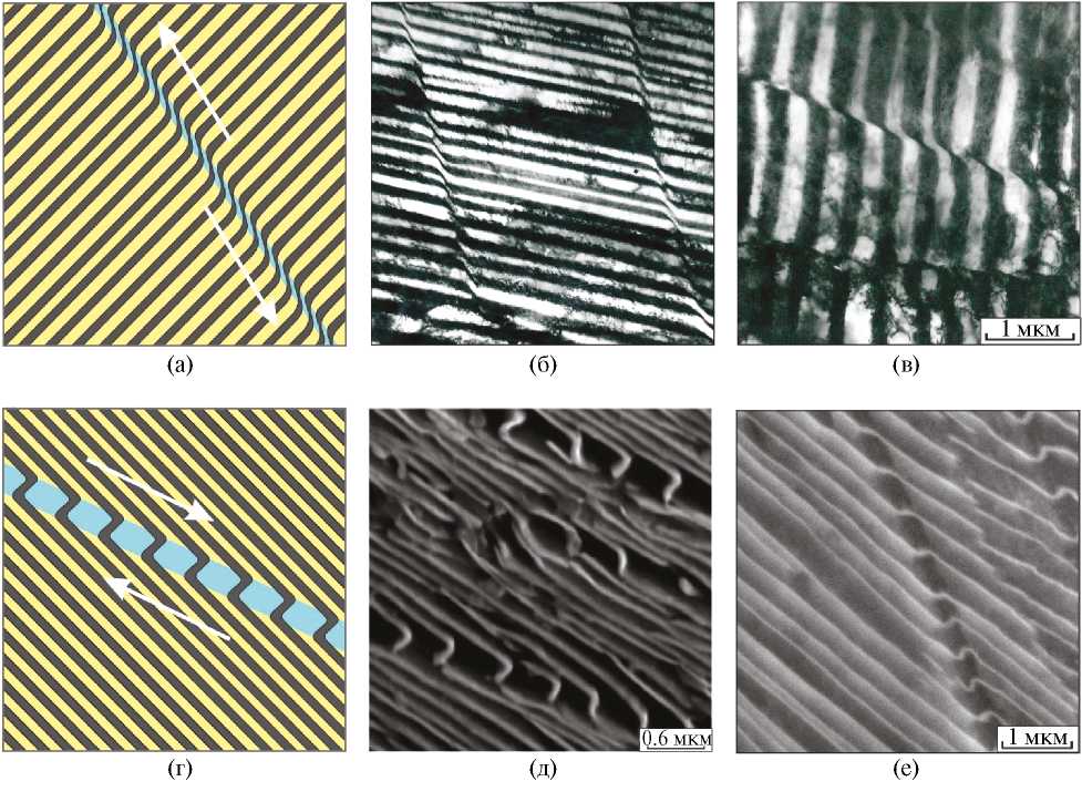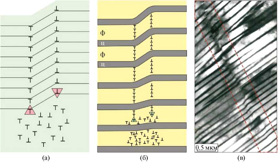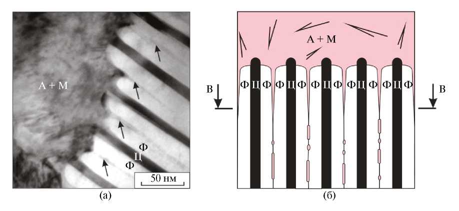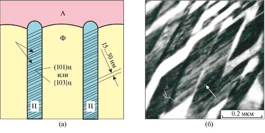 Рис. 1. Планарные дефекты в структуре пластинчатого перлита (указаны стрелками): а — схематическое изображение цементитных пластин с дефектами, возникшими в процессе распада аустенита (по представлениям Яковлевой с соавторами [7]); б — электронно-микроскопический снимок с планарными дефектами в пластически деформированном перлите; А — аустенит, Ф — феррит, Ц — цементит (снимок ПЭМ А.А. Батаева).