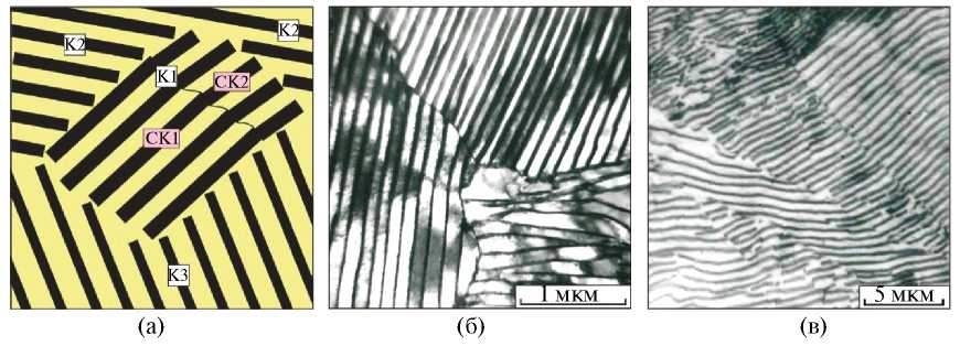 Рис. 3. Строение пластинчатого перлита: а — схема; б, в — снимки, зафиксированные методом просвечивающей электронной и световой микроскопии соответственно; К — колония, СК — субколония (снимки А.А. Батаева).